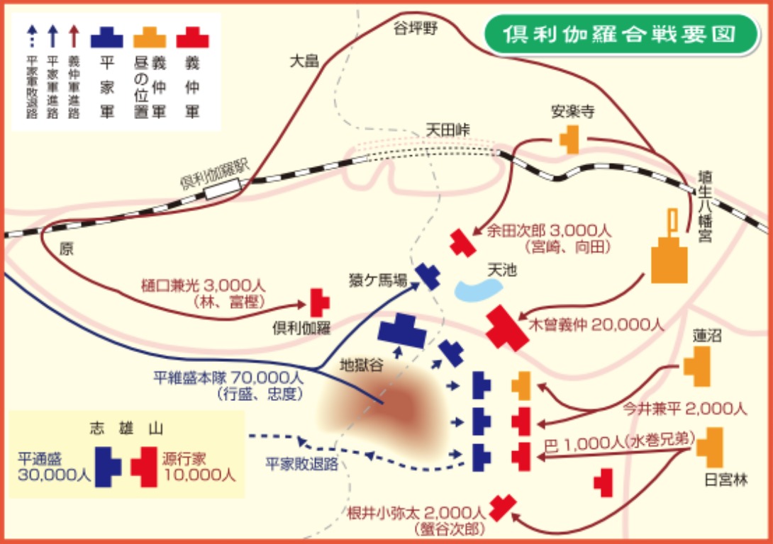 ✔ この戦いは源義仲の作戦がうまくいき、平氏の軍を壊滅に追い込む大勝利を収めた。