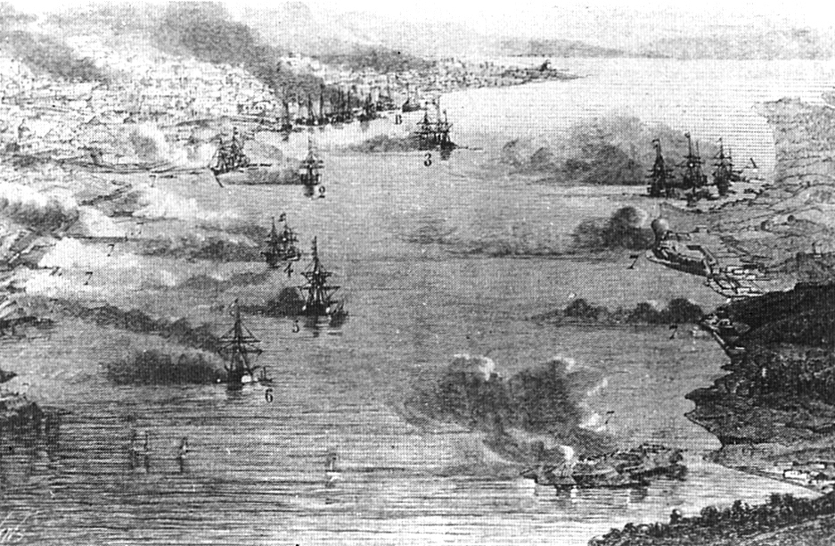 (イギリス艦隊と薩摩砲台の戦闘 出典:Wikipedia)
